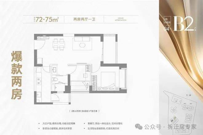 两种户型都是餐客厅一体化设计,公卫跟次卧可以组成类套房。B2户型还有双阳台。