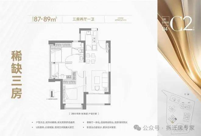 87-89㎡(三房一卫):分布在2栋05和08户型,两个端头位,竖厅结构,朝向为东南向;