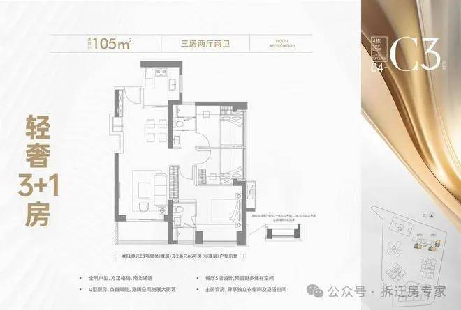 105㎡(三房两卫):分布在4栋1单元和2单元02、03户型(南向看花园),以及4栋2单元0506户型,竖厅结构,基本上朝正东向;