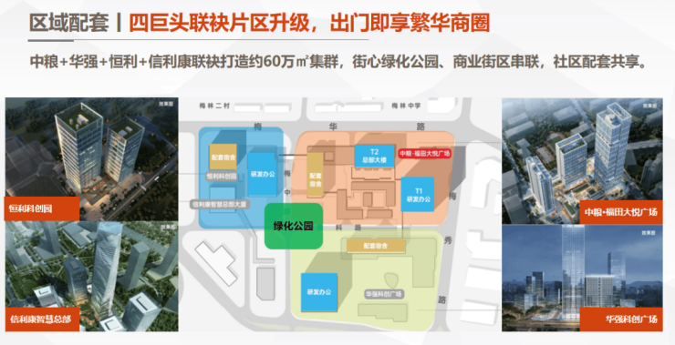 片区内的新近落成的卓越城、深业上城、新一代信息产业园、国际金融科技城等项目,不仅提供了优质的产业空间,也贡献了商业、商旅等各式服务配套,比如: