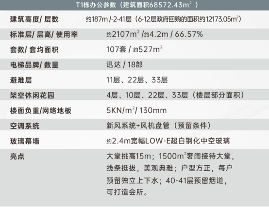 T1栋研发办公为约187米国际5A云端高度总部办公地标,配置了约15米挑高中空,大堂设置满足办公、商务、接待等过功能的1500㎡宽敞空间。