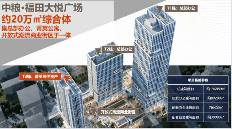 中粮·福田大悦广场项目是中粮集团旗下大悦城控股在华南打造的首个中心商办综合体项目。项目位于福田梅林梅彩智谷片区,占地面积约2.8万㎡,总建面约20万㎡,由2栋研发办公和1栋配套宿舍及2-3层配套商业构成。是集高端研发办公、总部大楼、菁英新贵住所、社区配套商业为一体的高端商务办公综合体,多元业态互通互融。