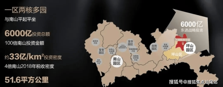 深圳高新区扩容,形成“一区两核多园”的发展布局,坪山高新园区规划面积(51.6平方公里),与南山并称“两核”,力争打造头号高新技术产业策源地和集聚地,头号创新型产业集群,同时深圳东进战略6000亿元投资总额,坪山承接深圳向粤东开拓的门户地位。