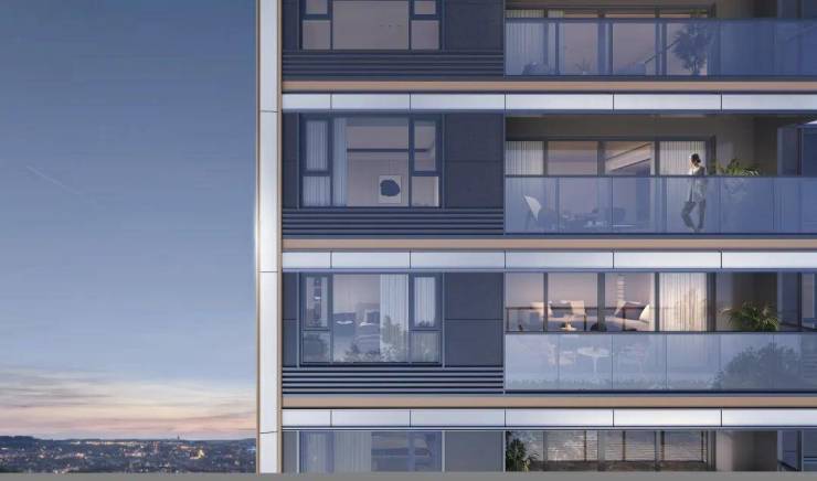 楼盘外立面:建筑外立面,实现千年古韵与现代立面美学结合,材质采用了世界塔尖奢宅标配的铝板和钻感玻璃,珍珠蓝搭配局部驼色点缀。