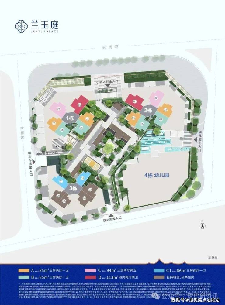 项目共由3栋总高32-33F的住宅组成,另外规划1所九班制幼儿园,全部3梯6户,总规划558套,其中可售商品房434户,公共住房73户,自持租赁住房51户。