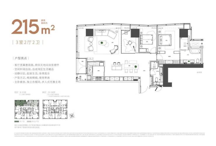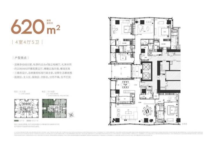 大尺度空间 纵享环幕视野大平面大尺度定位,层高约3.6米,横厅设计确保奢阔观景面,全户型纵享环幕视野。项目打造建面约215-620㎡纯粹品质公寓,顶层为建面约1270㎡公寓产品。