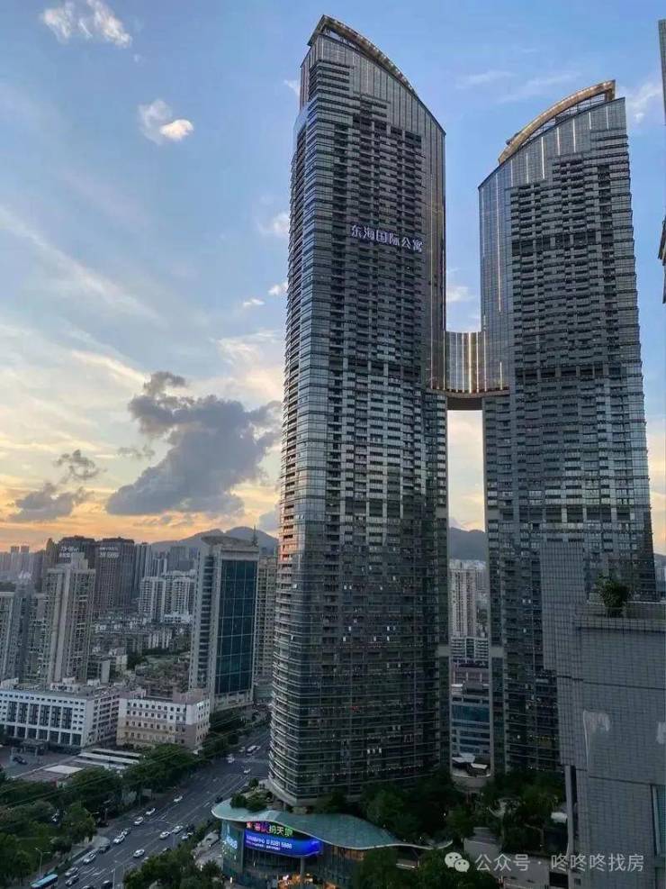 深圳东海国际公寓,总占地3.6万平方米,建筑面积50余万平方米。项目为双子塔结构分A、B两座,分别为80层和73层,主力户型为建面140-500平方米的平层及复式.。东海国际公寓配套欧陆皇室园林,采用多种名贵树种,天际会所位于两栋塔楼间(45层至49层间的空中连廊),建筑面积5000余平方米,内设有恒温泳池、海景健身房、空中篮球场、国际标准斯诺克球室、游戏室、私享影音室、瑜伽室、SPA 、私人宴会厅等精致设施。