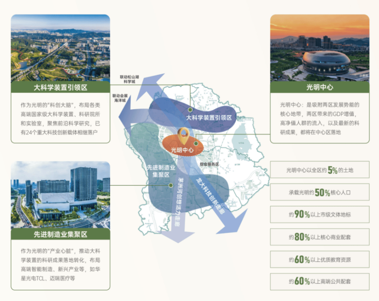 并汇聚深圳市光明区实验学校、光明区高级中学、深圳市教育科学研究院实验小学(光明)等重点学校,形成全龄段优质教育圈与高浓度文体资源带。