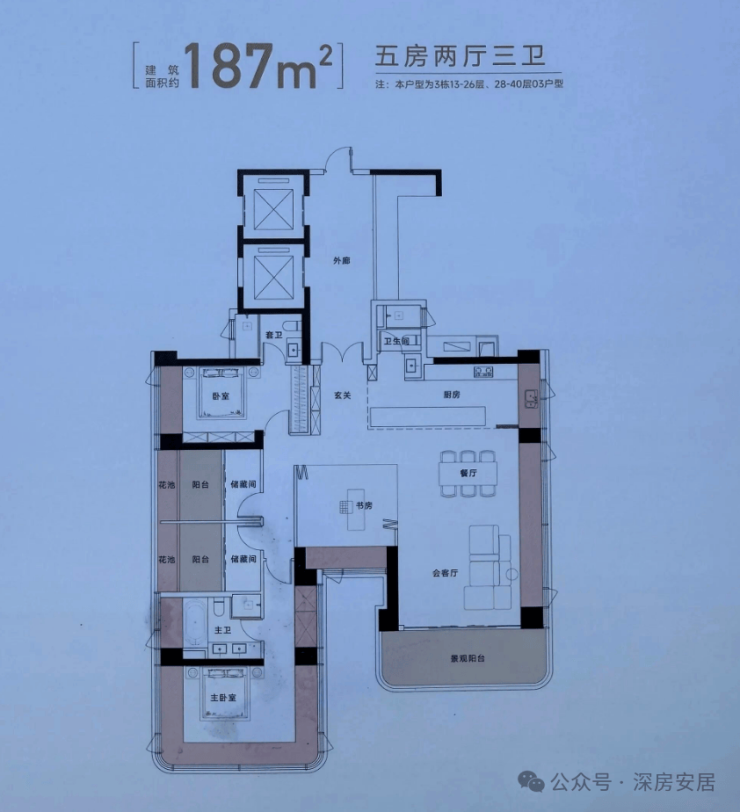 建面约187㎡五房两厅三卫,得房率约111%(包含赠送),西南朝向看海景景观。双套房设计。