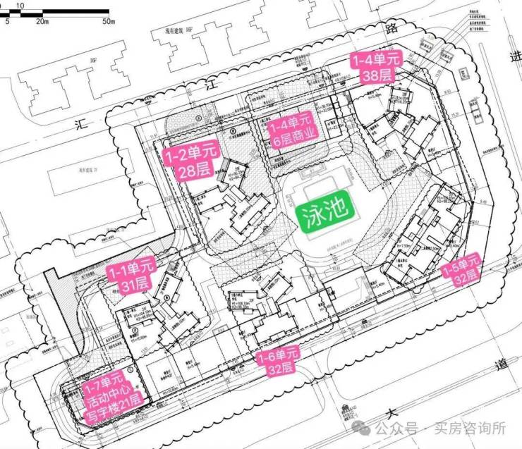 共规划建设7栋楼体,其中5栋为28-38层的高层住宅,共504户,均采用2梯4户或3梯4户的设计,另有1栋6层商业和1栋21层的办公产品,项目推出住宅产品为94-120㎡,以及161㎡6米层高的复式,此外小区内设有泳池配套。