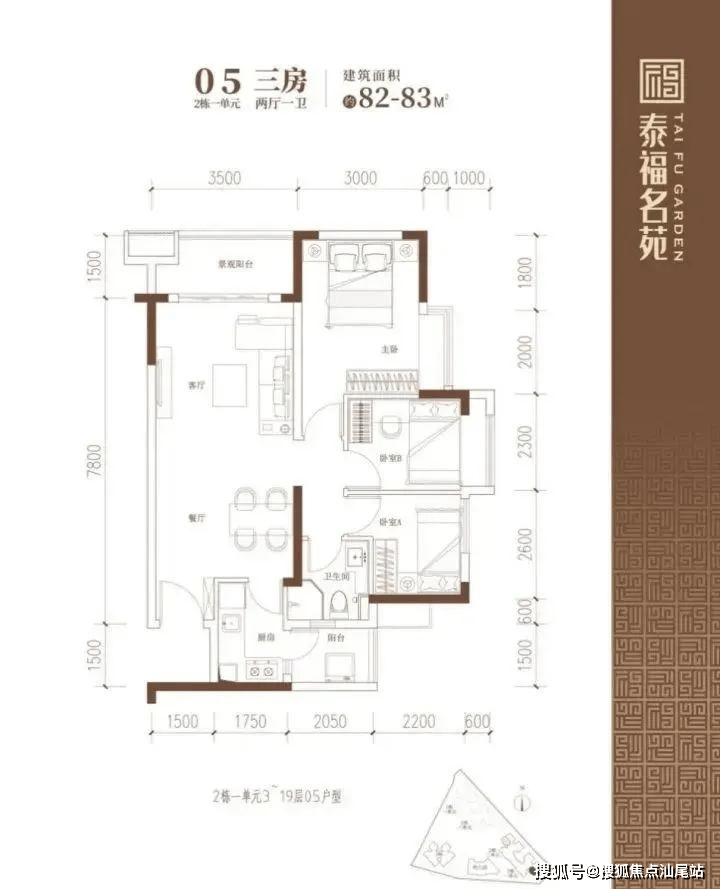 建面约82-83㎡的3房2厅1卫户型,在保证空间尺度感的前提下做到3个房间,实用性高
