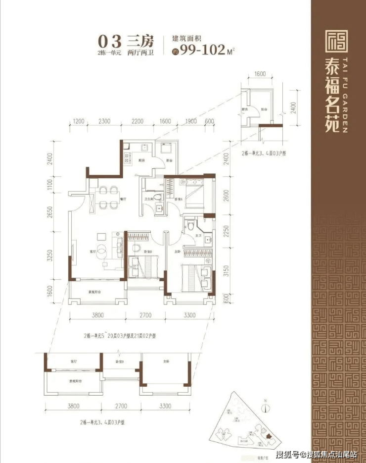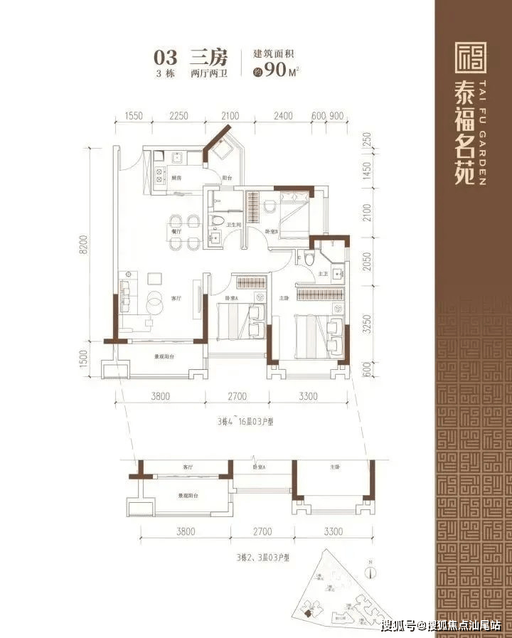 90-102㎡的3房2厅2卫户型。这几个户型都是在主人房多设计一个卫生间,私密性更强,也让家人间的生活更加方便。