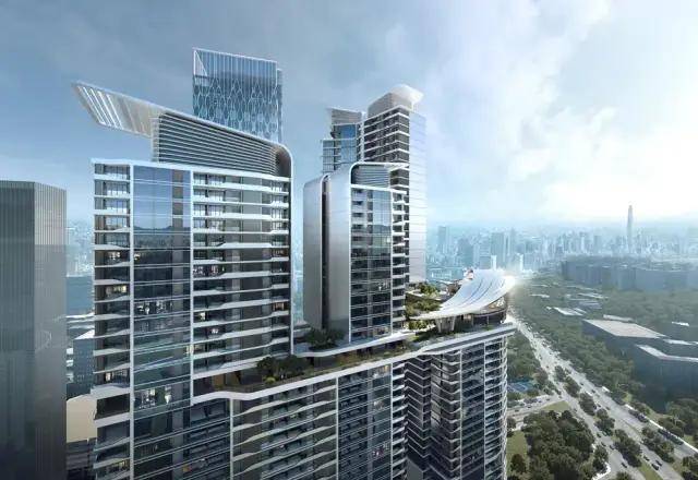 服务式公寓塔楼与周边的地铁站无缝连接,可通过地面裙楼大堂或是通过地下商业大堂出入口便捷通达。设计在塔楼150米处打造了空中平台,设置了空中花园、健身房、会所以及各种休闲和娱乐设施,在俯瞰城市壮丽美景之际,为面向深圳中央商务区的高端公寓的居民提供了宜人的公共空间。服务式公寓塔楼的弧形阳台立面以云朵为设计灵感,简约的轮廓搭配银白色铝饰面,突显出典雅的几何之美。