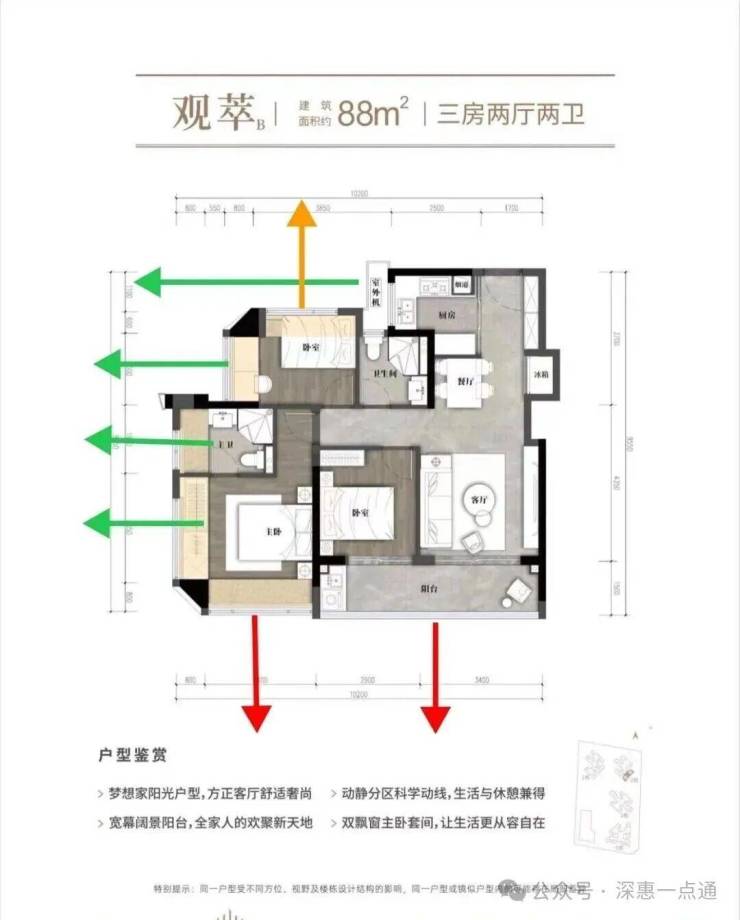 再来看一下0506的88㎡这里两个户型是一模一样,唯一区别就是绿色箭头房间朝向一个朝马路一个朝花园,0506也是2栋的户型最好东南朝向,同时景观视野还不错看学校