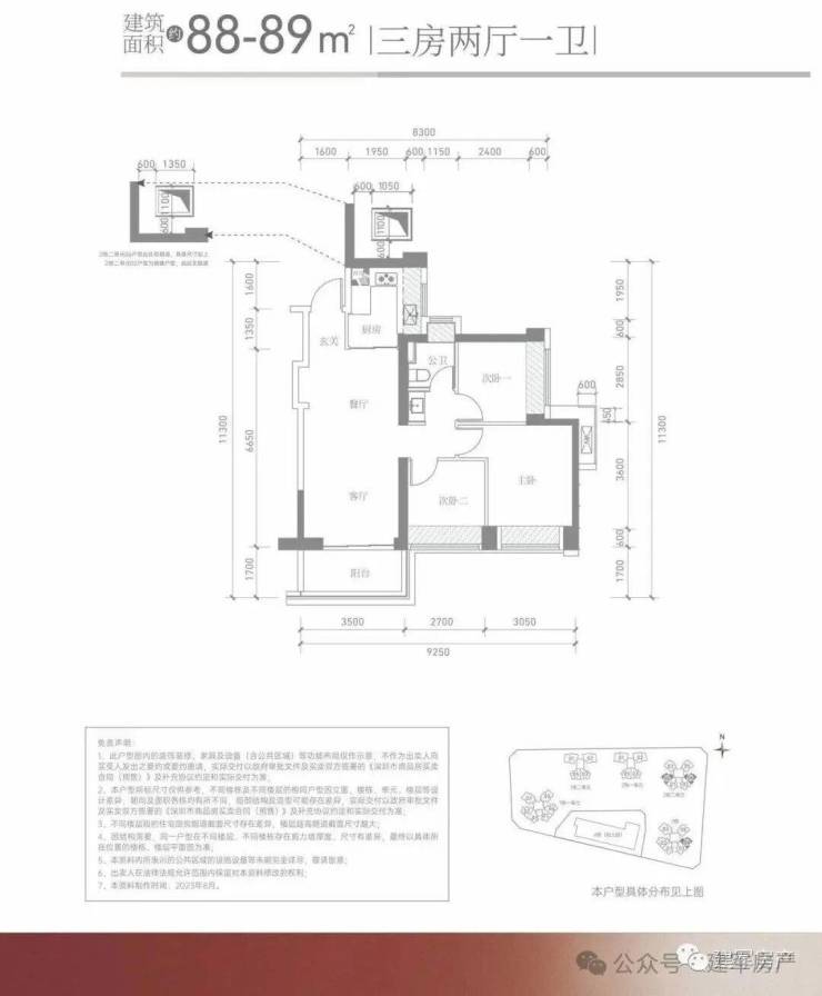 89㎡的3房2厅1卫,设计的竖厅格局,客厅3.5米开间,LDKB一体化设计,S墙设计预留冰箱位,3个卧室分别做到了3.05米/2.85米/2.7米的宽度,U型厨房,得房率:73.87%(不含赠送),阳台进深1.7米,有西南或东南朝向。