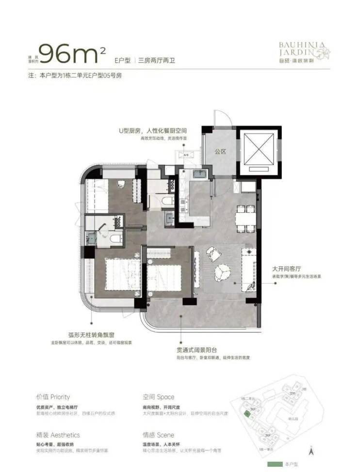 96m²三房两厅两卫的E户型: