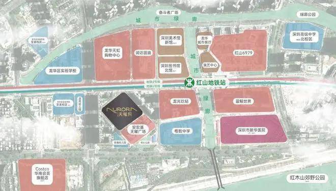 近享醇熟商业,片区超200万方商业体量,超越福田CBD商业集群,周边COSTCO(会员招募阶段,预计年底开业)、龙华天虹、红山6979、蓝鲸世界(在建中)等标杆商业环绕。