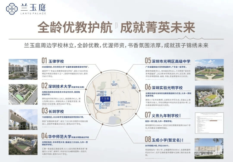 • 九年一贯制学校:直线距离约50米深圳市光明区玉律学校(教育部直属重点师范大学——华东师范大学“全国新基础教育基地学校”),深圳市光明区长圳学校、华中师范大学附属光明勤诚达学校。直线距离约1公里处,规划九年一贯制学校,教育资源更加优渥,未来价值不言而喻!