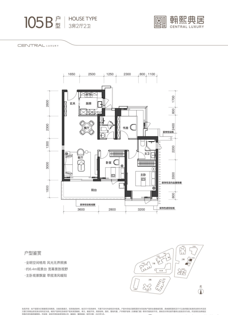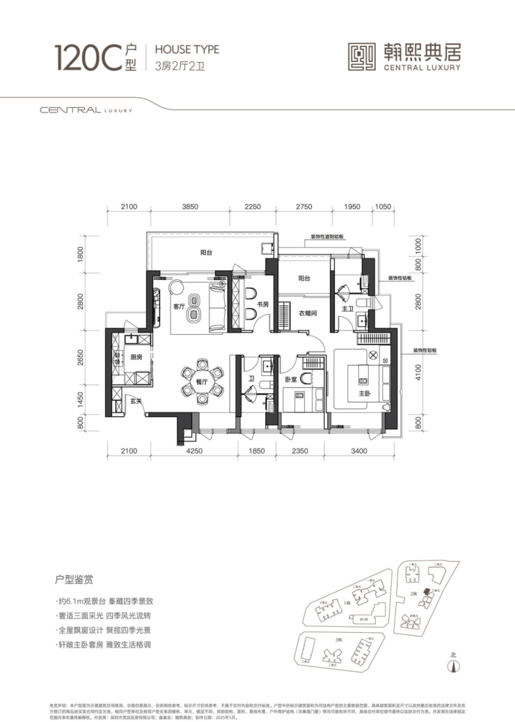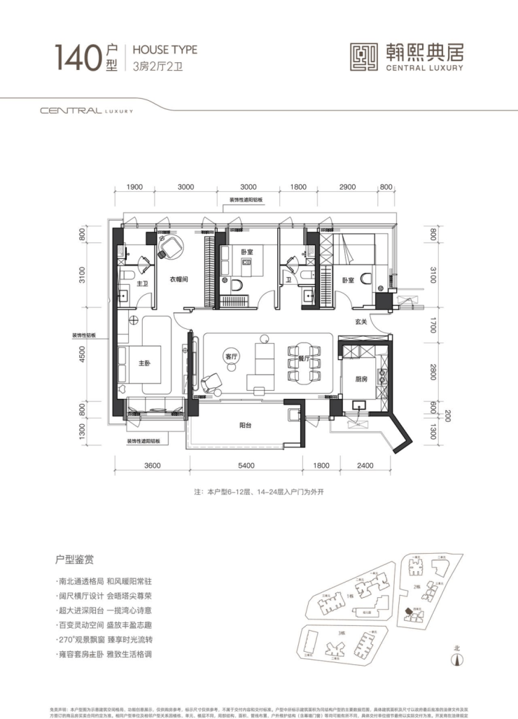 该户型为 02 地块的唯一一条腿,非常稀缺。户型南北通透,带大主卧套房的奢居型三房。带 5.4m 观景台,大横厅奢阔空间设计,主卧同客厅阳台、餐厅三面宽朝西南。北向双次卧、双卫生间、拓展空间共五面宽一字排开,视野全面俯瞰社区内园林,静谧舒适。