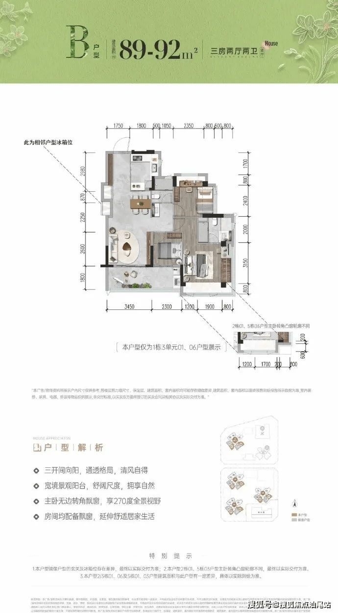 :总价330万起,LDKB一体化+全飘窗,得房率90%。