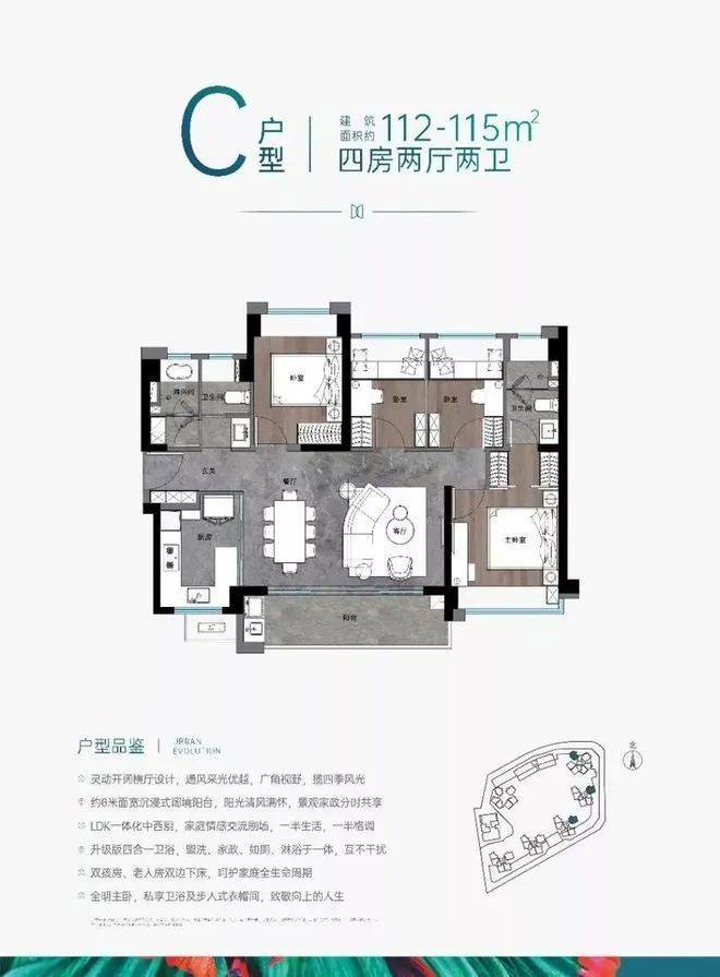 户型分布,79-81㎡的3房1卫朝向为西南向,99-102㎡的3房2卫作为主力户型朝向为正南向,而112-115㎡的4房2卫的大户型朝向为南北通透。