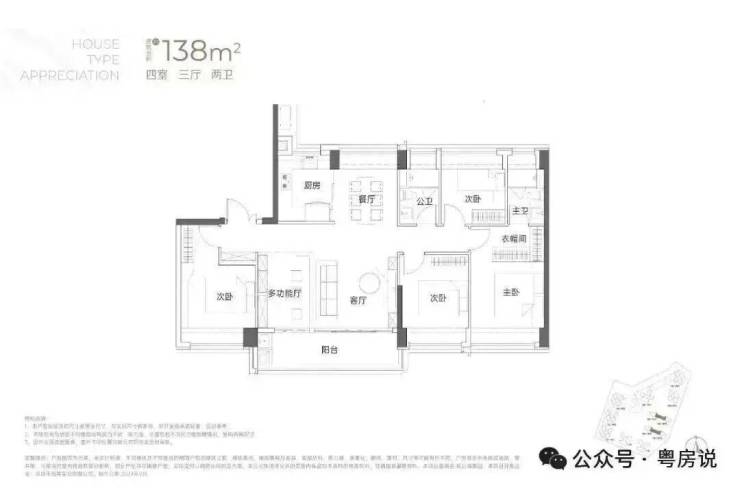 138㎡的4房2厅2卫:竖厅南北通透格局,专梯入户,客厅6.1米开间,LDKB一体化,全屋飘窗,4个卧室分别做到了3.9米/3.25米/2.9米/2.8米的宽度,主卧加1个次卧270°全景飘窗,客厅出6.1米长的大阳台,U型厨房,得房率约95-97%(包含赠送),阳台主朝西南向。138平米户型分布在3栋1单元、3栋2单元、4栋1单元、4栋2单,4个单元纯大户型。