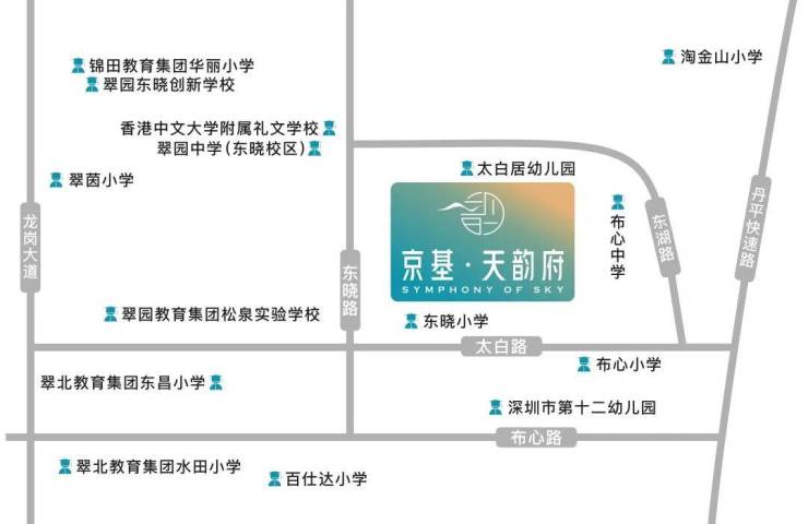 展开地图来看,京基天韵府家门口就是太白居幼儿园、布心中学、布心小学、东晓小学,周边还有10所学校环绕。(注:积分及入学相关政策,以入学当年教育局和学校规定为准)