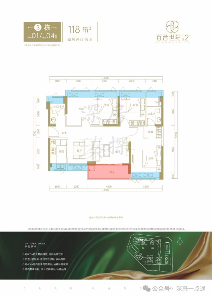 118㎡的4房2厅2卫,3栋1单元04/3栋2单元01户型,设计的是竖厅南北通透格局,进门入户玄关,客厅4.15米开间,客餐厅分离设计,南北双阳台,四开间朝南,4个卧室分别做到了主卧16.5㎡/次卧11.1㎡/次卧9.57㎡/次卧8.25㎡(包含墙体飘窗),U型厨房,卫生间干湿分离,得房率约76.2%(不含赠送),阳台主朝西南或东南向。套内面积89.55㎡+赠送15.44㎡=104.99㎡,加上赠送得房率约89.37%。