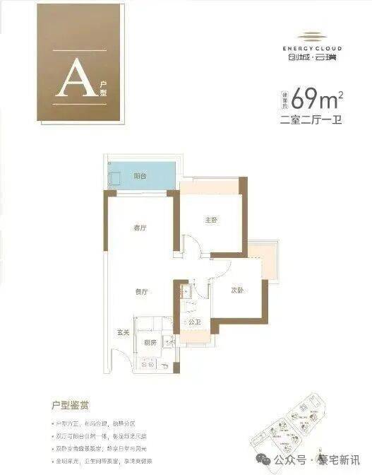 69㎡的2房2厅1卫,设计的是竖厅格局,客厅3.3米开间,LDKB一体化设计,2个卧室分别做到了主卧9.76㎡/次卧7.77㎡(实测面积,去掉墙体),U型厨房,卫生间干湿分离,得房率约74.4%(不含赠送),套内面积51.04m²,西北/东北或东南朝向。