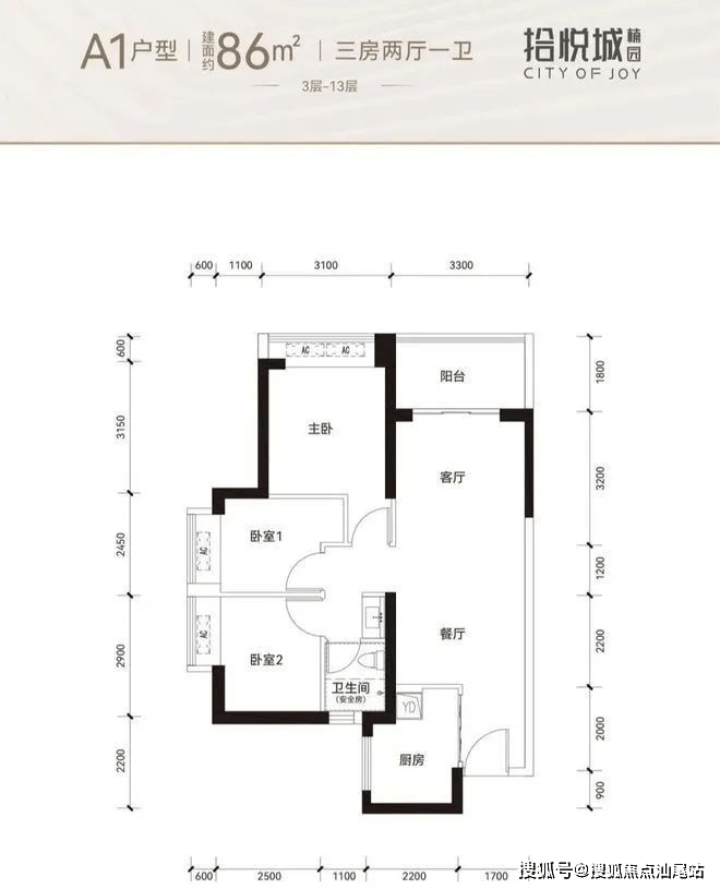 建面86平米:3房2厅1卫,传统的竖厅动静分区格局;刚需紧凑型三房,功能间都齐全,但是空间有限,典型的‘麻雀虽小,五脏齐全’,一个卫生间不是槽点,市面3房1卫的户型太多,预算有限的情况下这是最好的选择;86平米客厅开间只有3.3米,客厅显得有些局促,三个房间的大小还可以。