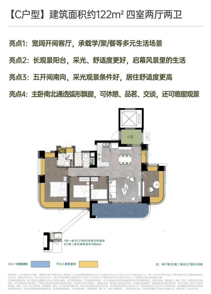 建面约142㎡南北方厅 阔景四房;