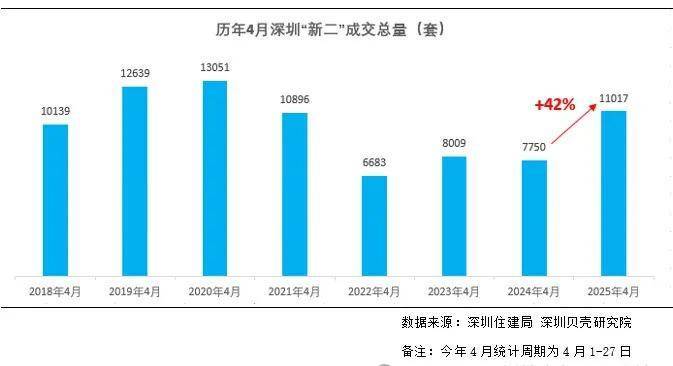 在政策环境持续宽松的作用下,市场预期改善,有效刺激购房需求积极释放,今年“银四”成交活跃度高于去年乃至前几年同期。据深圳贝壳研究院监测,本月截至27日,深圳“新二”成交总量为11017套,比去年4月增长42%,创近五年新高。