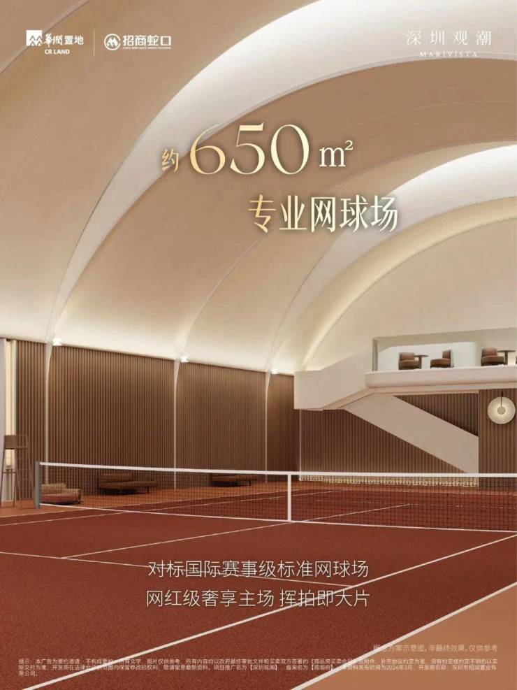 「深圳观潮」的超级底盘除了街区商业、立体园林、会所配套之外,还有一个室内篮球场 + 一个室内网球场。过去大多项目都只做室外球场,平时大家使用的时候难免产生噪音影响,「深圳观潮」这次直接卷成了室内球场。