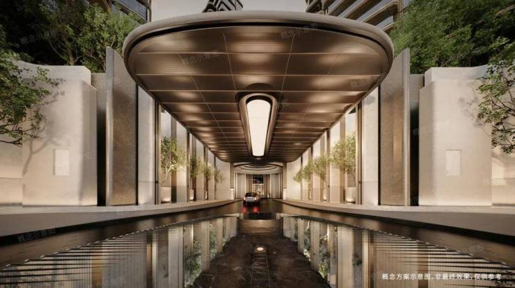 主入口设计了车马院,内外做了双水盘环岛,内环岛专属归家落客。通道两边有净高9米的桅杆造型立柱提升空间场域,再以8株稀有乔木点缀引入勃勃生机,有“九五至尊”、”八方来财”的美好寓意。