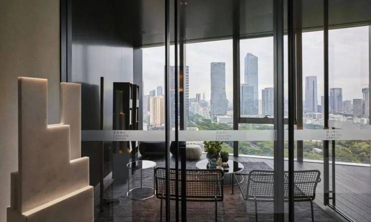 秘书办公室 由深色金属墙面、玻璃围合,深色金属网天花、水泥结构柱、深色金属植栽槽,冷酷而充满诗意,与窗外城市风景相呼应。汉京金融中心售楼处电话:400-088-3336(营销中心)