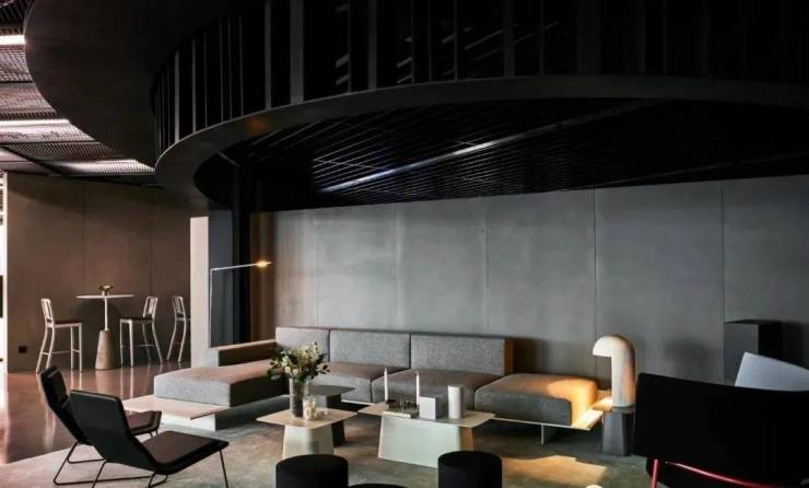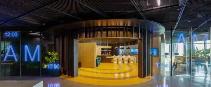 设计团队延续建筑氛围,在休闲区置入绿地广场的概念,创造在建筑中漫步的体验,朴素的水泥主墙与深色金属门洞,连同两旁有节奏感的LED模块玻璃与绿植形成切割关系,用半围合的空间暧昧表达未来不确定属性。