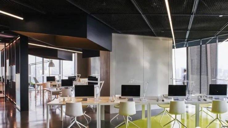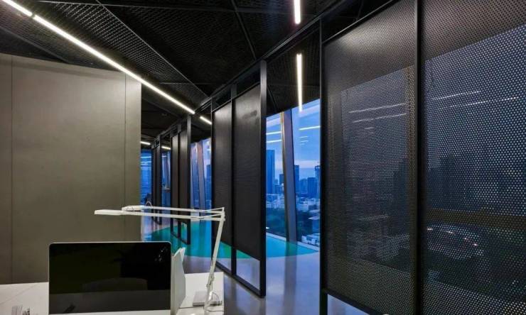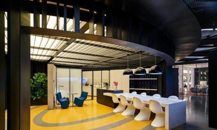 斜墙与LED模块玻璃围合成开放办公区、讨论区,利用水泥结构柱、绿植轻松的界定空间尺度,天花深色金属灯筒散发出光线,光线能产生某种富于表现力的特质,线性灯与金属网的延伸方向一致,强调空间的流动性与秩序性。汉京金融中心售楼处电话:400-088-3336(营销中心)