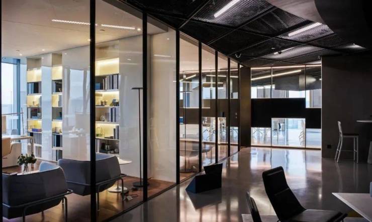 通过管控的VIP电梯通道作为董事长及贵宾专用动线,同时划分出客人等候区,强调私密性与礼仪感,呈现出严谨清晰的办公秩序。