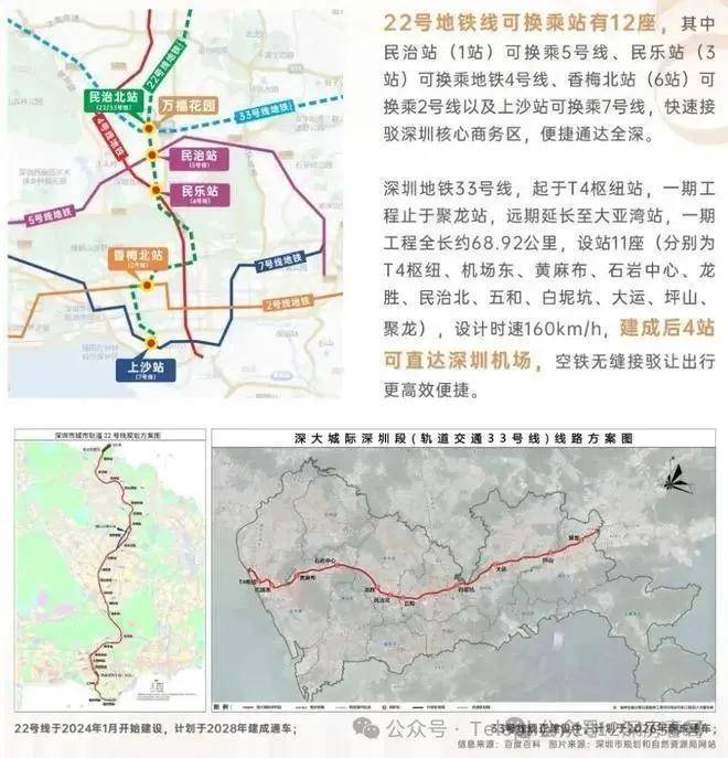 【交通配套】:项目距离地铁口仅约200米,乘坐地铁22号线(在建中,预计2028年通车)南行,5站到福田,9站直达福田上沙站,还可便捷换乘5号线、4号线、2号线、7号线,北行直抵东莞;乘坐地铁33号线(在建中,预计2026年通车)5站可直达深圳机场。