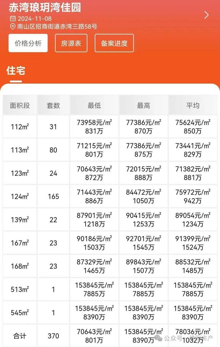 南山赤湾,南山1978·半岛擎峯,备案名:琅玥湾佳园于2024年11月8日取证入市,本次推出1/2栋,共370套房源,面积有113平的3房2卫,124-140平的4房2卫,167平的5房3卫户型,备案均价7.8万/㎡,备案单价7.06-9.27万/㎡,总价801-1545万/套,计划在2026年3月份带精装交房。