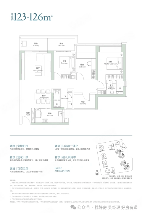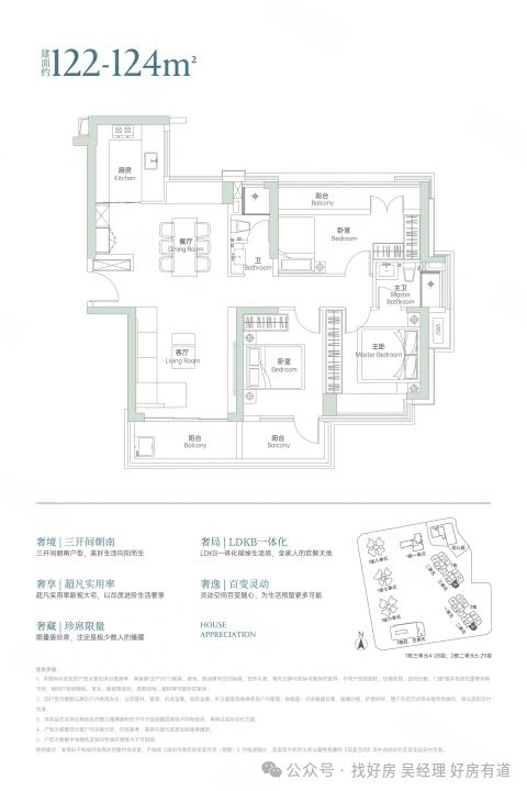122-124㎡ 和 123-129㎡ 户型均设计为四房两卫,前者为通透4房,后者为竖厅4房。这些户型均采用南北通透设计,朝南向,光线充足、通风好。