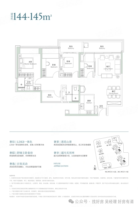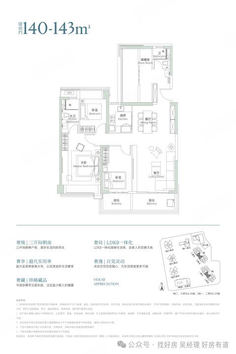 140-145㎡ 户型同样设计为四房两卫,采用竖厅设计。空间更为宽敞,部分高层可享香蜜湖景观,主卧采用套房设计提升居住私密性。