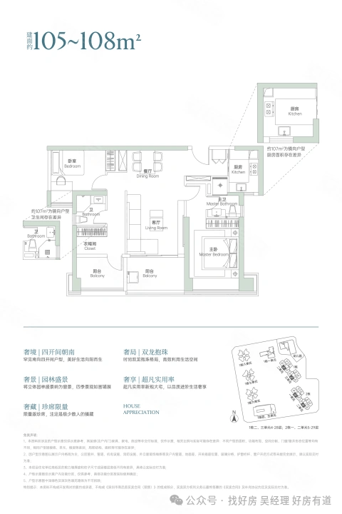 105-108㎡ 户型设计为三房两卫,采用“双龙抱珠”布局。这类户型适合刚需和刚改家庭,空间布局合理,做到了干湿分离、动静分离。