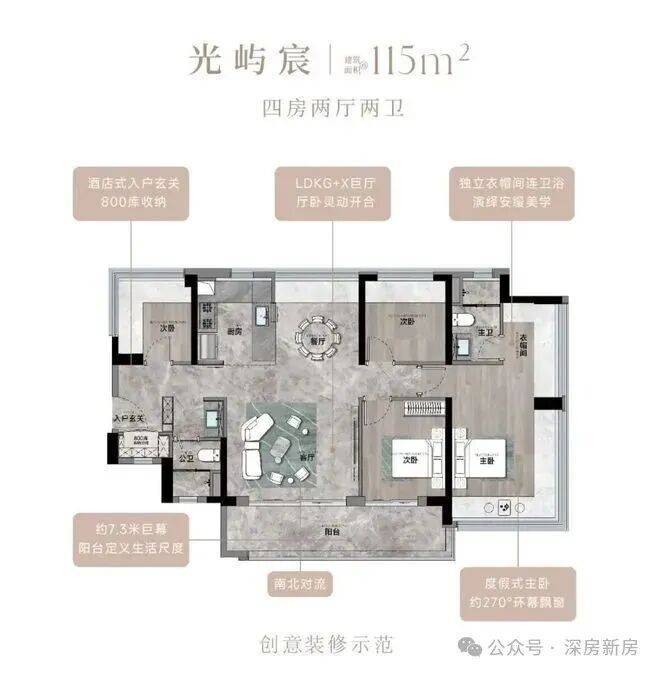 115㎡的4房2厅2卫,设计的是竖厅南北通透格局,进门入户玄关,客厅4.45米开间,餐客厅分离设计,客厅连接次卧出10.87m²的观景大阳台,L型中式+岛台灵动式厨房,公卫三段式干湿分离,得房率约78.27%(不含赠送),阳台主朝东南或西南向。靓点:南北对流+7.25米长超大观景南向阳台,超大主卧+270°无柱转角飘窗