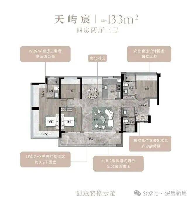 133㎡的4房2厅2卫,设计的是竖厅南北通透格局,进门入户玄关,客厅5.4米开间,餐客厅分离设计,客厅连接次卧出12.3m²的观景大阳台,L型中式+岛台灵动式厨房,公卫三段式干湿分离,得房率约78.27%(不含赠送),阳台主朝东南或西南向。靓点:超大客餐厅南北对流+8.2米长超大观景南向阳台,超大主卧+270°无柱转角飘窗