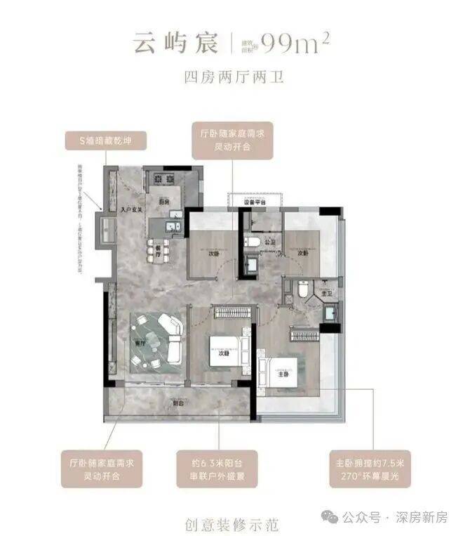 99㎡的4房2厅2卫,设计的是竖厅格局,客厅3.35米开间,LDKB一体化,S墙设计预留双开门冰箱卡槽位,三开间朝南,动静分区,U型厨房,公卫三段式干湿分离,赠送设备平台,得房率约78.27%(不含赠送),客厅连接次卧出9.37m²大阳台西南或东南朝向。靓点:99平做到了4房2卫,主卧270°无柱转角飘窗,厨房烟道外置+额外赠送设备平台,并且是纯南向格局。