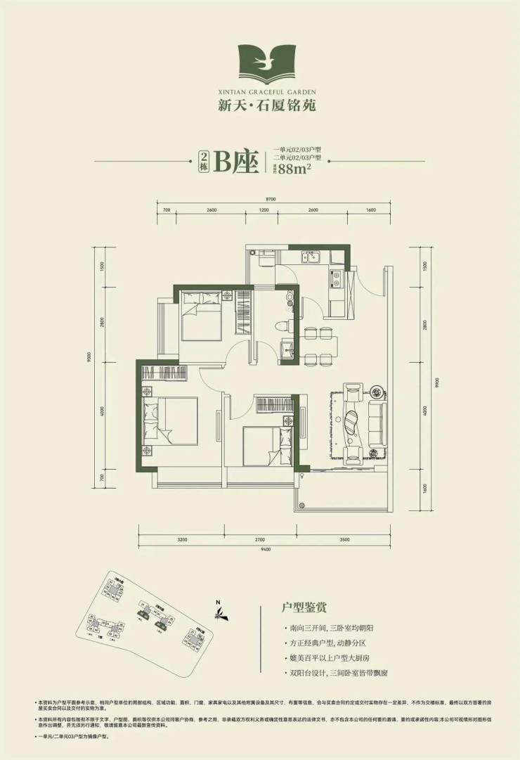 🔸2栋B座一单元02、03户型、2栋B座二单元02、03户型:面积约为88㎡的3房2厅1卫;