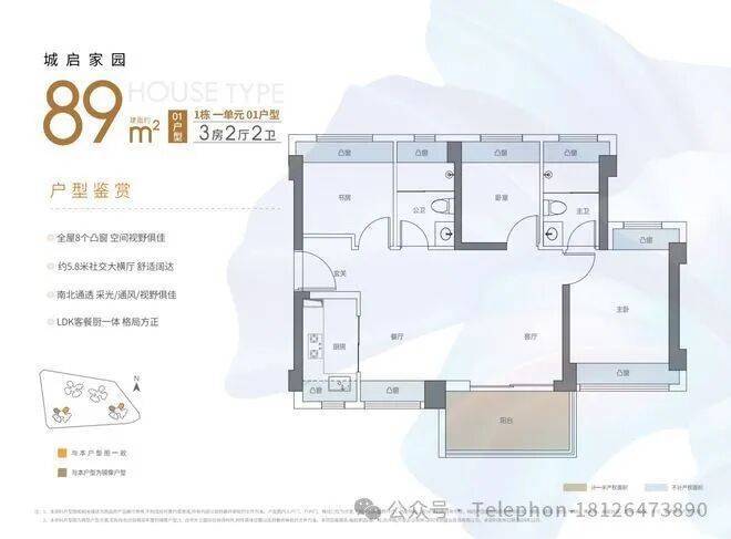 89平横厅户型,最亮眼莫过于约5.8米社交大横厅,南北通透,拥有更大的采光面和更好的通风效果。