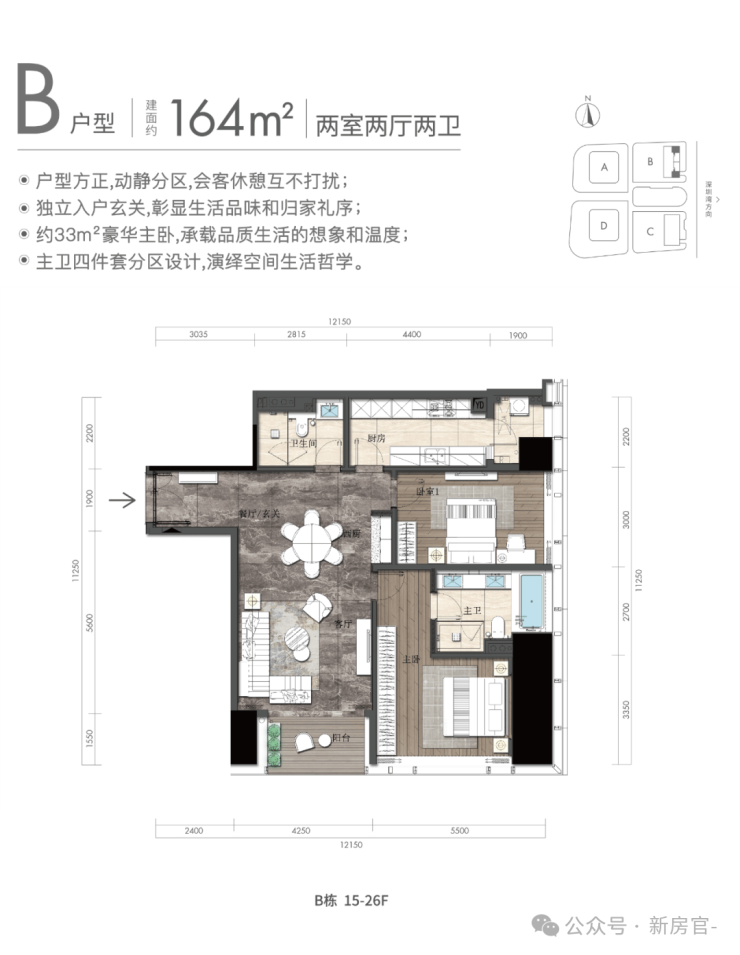 恒裕深圳湾2房户型为162/164平,总价区间为1887-2429万/套。