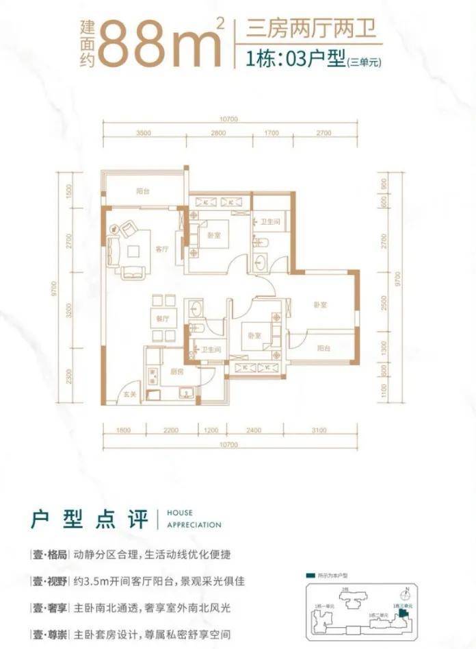 1栋三单元03号房,北向户型,动静分区布局,客厅开间3.5米带有1.5米进深阳台,主卧通透开间进深比良好,空间利用较为充分,南北双次卧,空间较为紧凑。居住空间通风效果较好,拥有良好的视野。